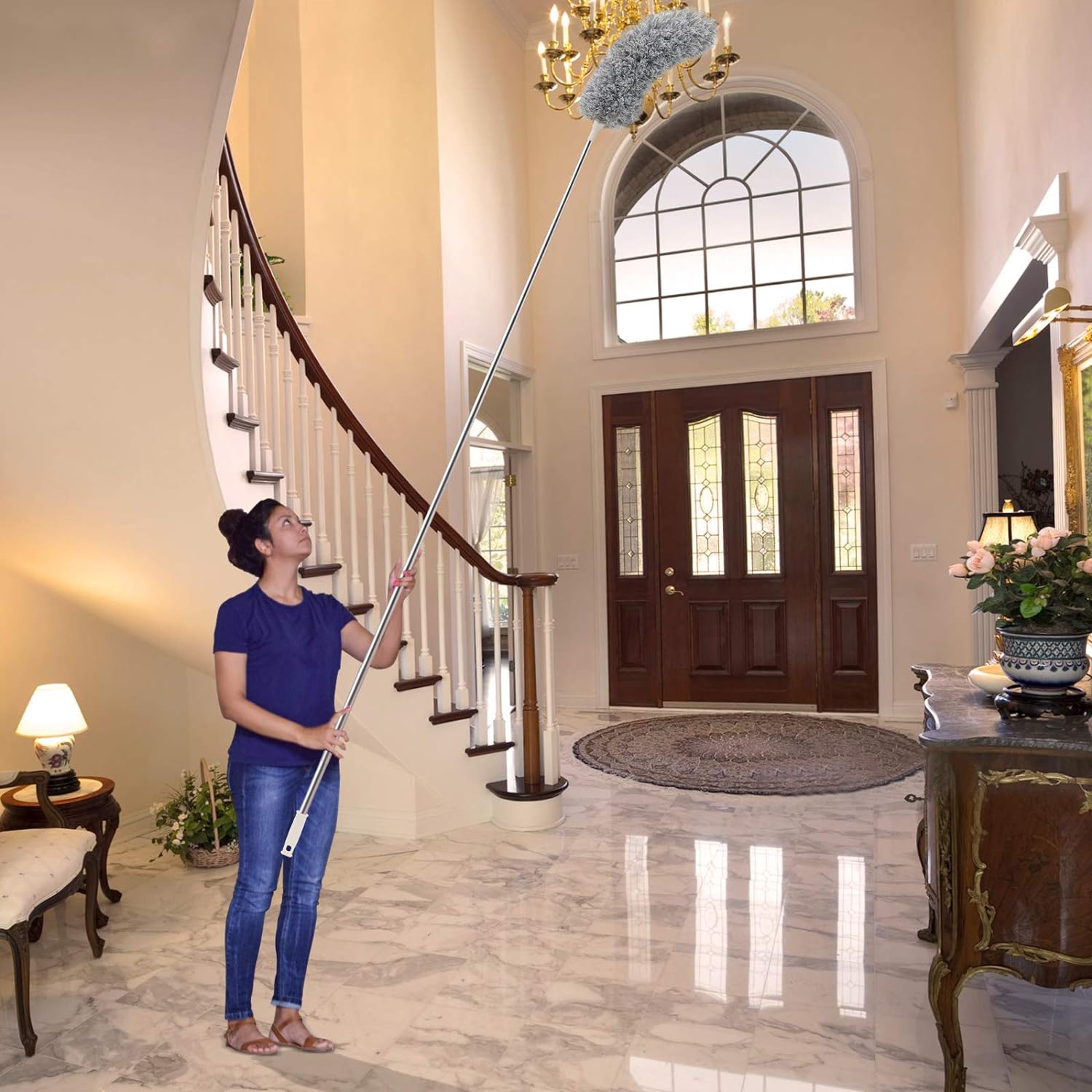 With a 144-inch expandable pole handle, this duster provides extended reach, making it ideal for cleaning high ceiling fans, chandeliers, and other elevated surfaces.